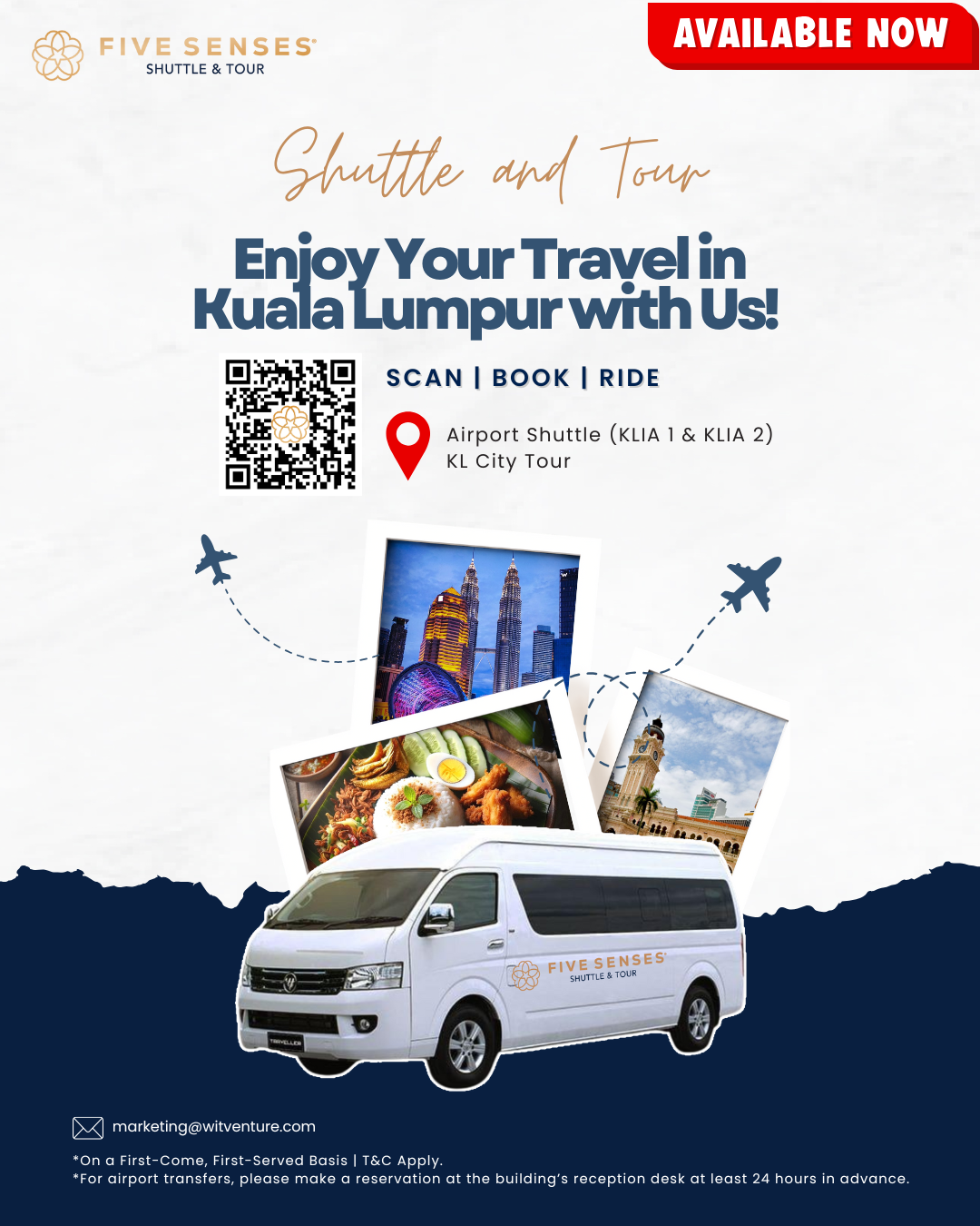 The best part? Itโs completely free โ exclusively for Five Senses guests. Enjoy FREE rides to some of the best spots in Kuala Lumpur โ including KL Tower, TRX Exchange Mall, Petaling Street Market, and more! ๐๏ธ๐๏ธ
